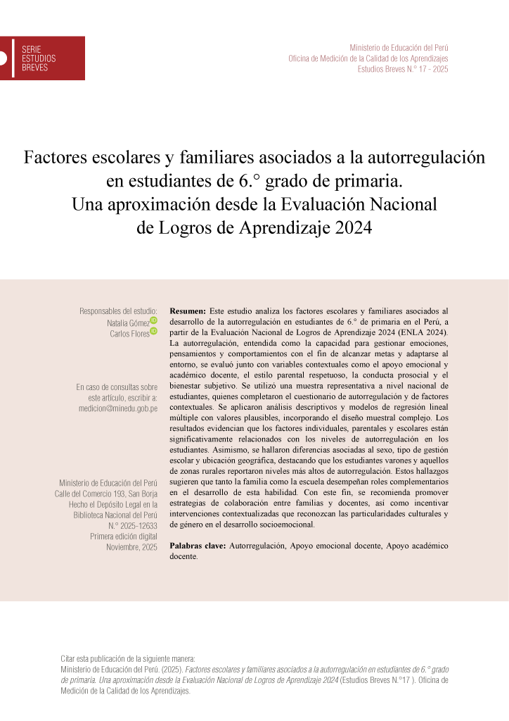 Leer másEl presente estudio analiza los factores escolares y familiares asociados al desarrollo de la autorregulación en estudiantes de 6.°grado de primaria en el Perú, a partir de la Evaluación Nacional de Logros de Aprendizaje 2024 (ENLA 2024). La autorregulación, entendida como la capacidad para gestionar emociones, pensamientos y comportamientos con el fin de alcanzar metas...