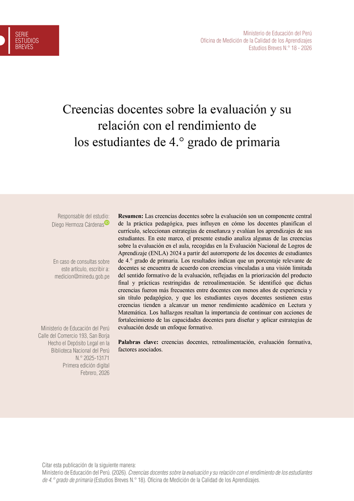 Las creencias docentes sobre la evaluación son un componente central de la práctica pedagógica, pues influyen en cómo los docentes planifican el currículo, seleccionan estrategias de enseñanza y evalúan los aprendizajes de sus estudiantes. En este marco, el presente estudio analiza, a partir del autorreporte de los docentes, algunas de las creencias sobre la evaluación...