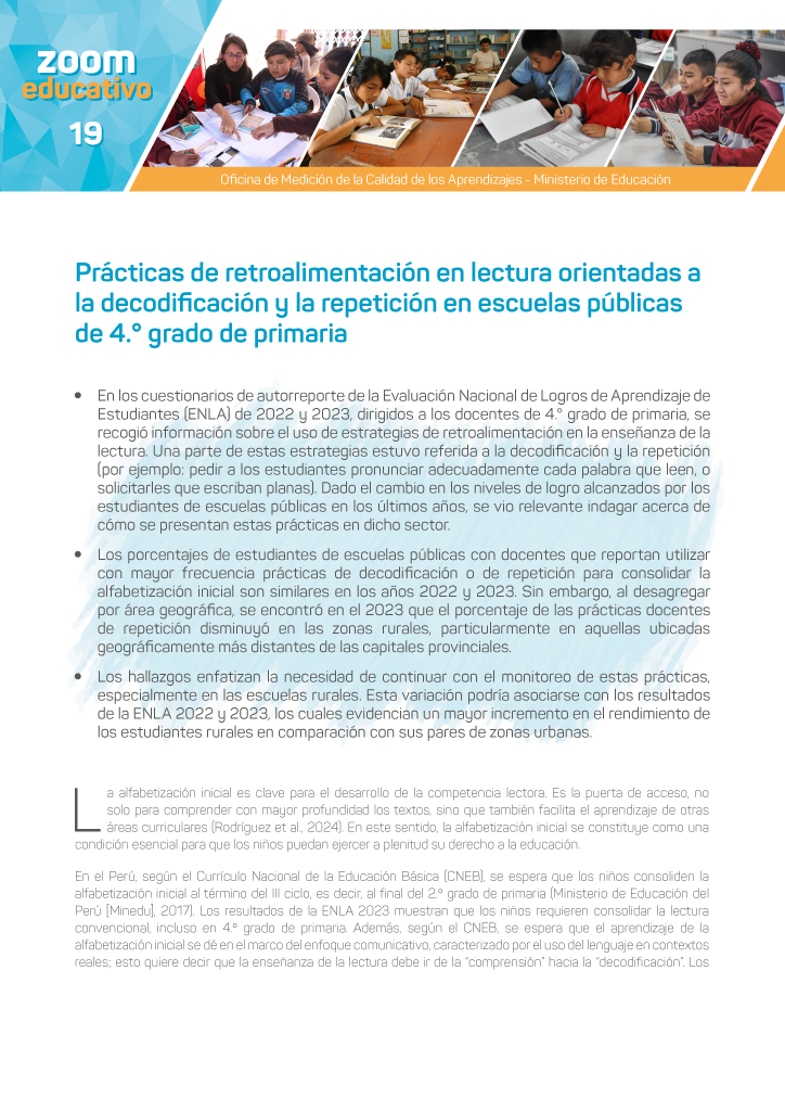 En la presente investigación, se analizaron las prácticas de retroalimentación en lectura orientadas a la decodificación y la repetición empleadas por docentes de 4.° grado de primaria de escuelas públicas. Para ello, se examinaron las respuestas de los docentes...